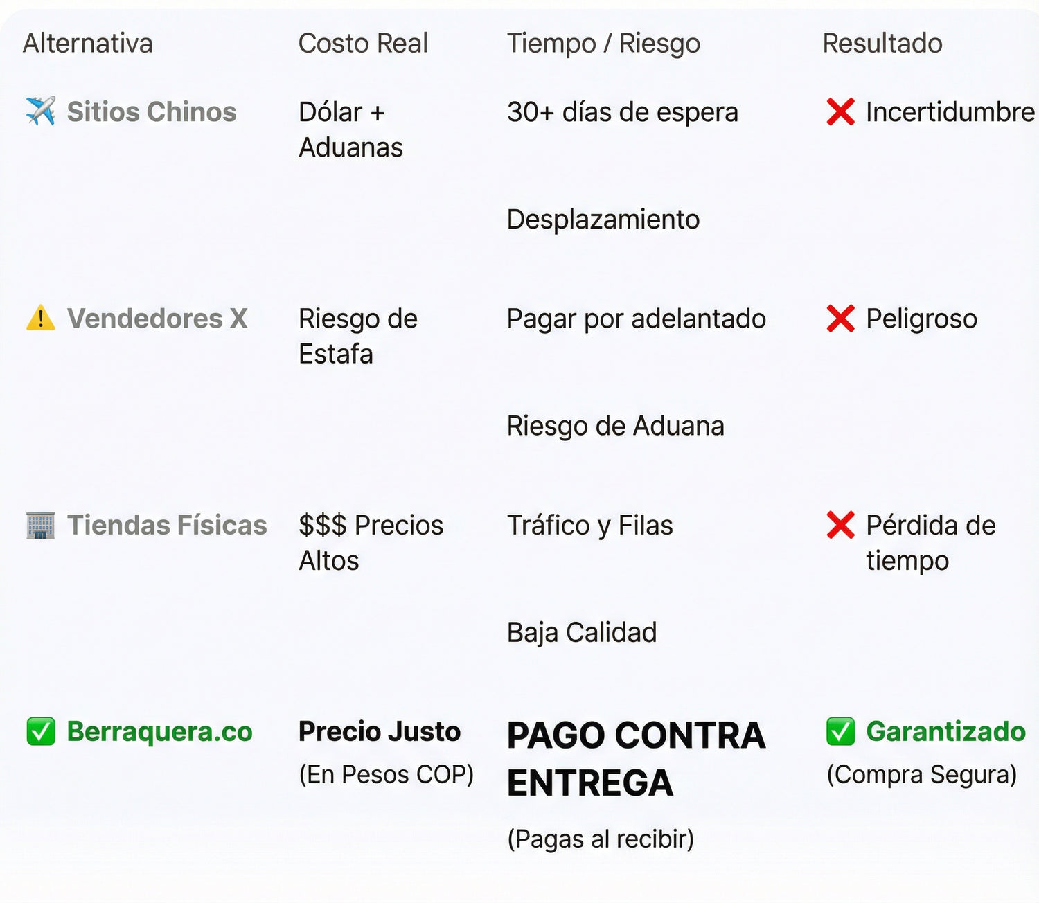 En Berraquera.co eliminamos el miedo a comprar por internet. Nos cansamos de las esperas eternas y las estafas, por eso creamos una tienda para colombianos donde la seguridad es lo primero.