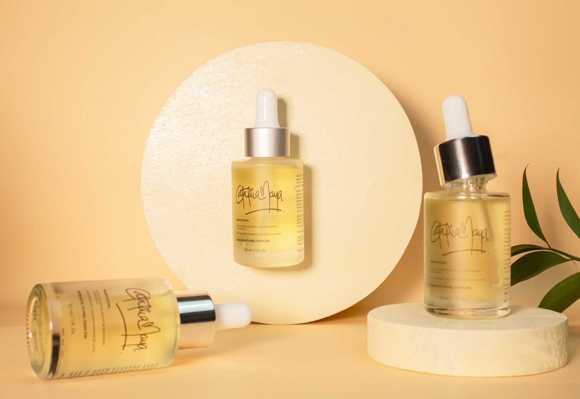 Óleo Facial: Argán · Macadamia · Vitamina E (base nutritiva con jojoba y almendras).